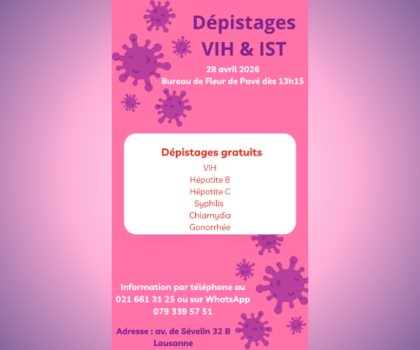 Prochain dépistage dans la rue le jeudi 26 mars 2026. Rendez-vous au bus de Fleur de Pavé, avenue de Sévelin de 22h à minuit.