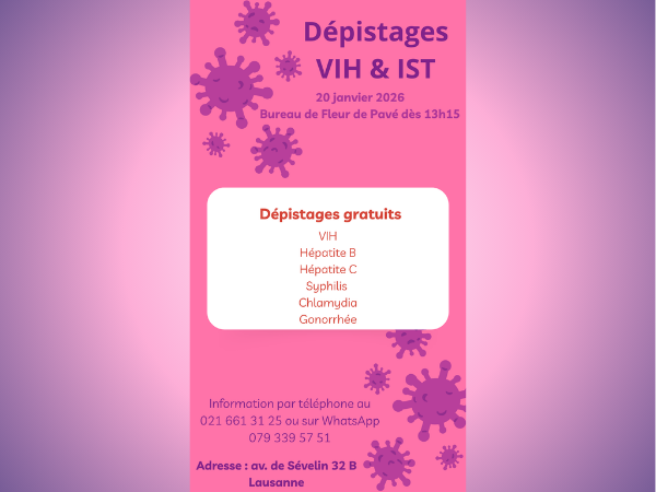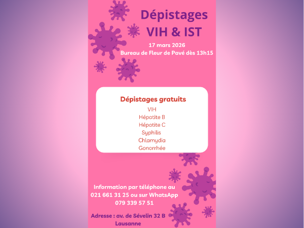 En collaboration avec les infirmières Unisanté de Lausanne, Fleur de pavé propose une fois par mois une permanence santé autour des questions liées aux Infections Sexuellement Transmissibles /VIH Sida. Un dépistage gratuit ( VIH, hépatites B & C, Syphilis , Gonorrhée et Chlamydia) est proposé pour toute personne intéressée. La permanence a lieu dans les bureaux de l’association à Lausanne au 32B avenue de Sévelin. La prochaine date est :